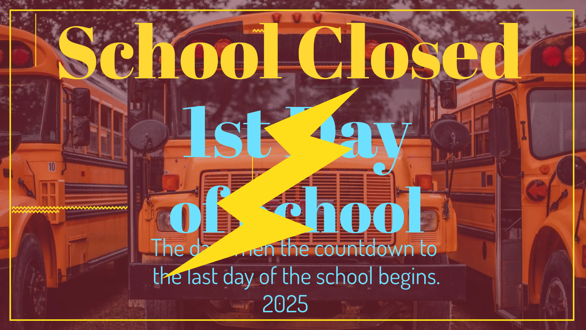 he image shows a banner with three yellow school buses in the background. Overlaid text reads: "School Closed," "1st day of school," and "The day when the countdown to the last day of the school begins. 2025." A yellow lightning bolt cuts diagonally across the text.