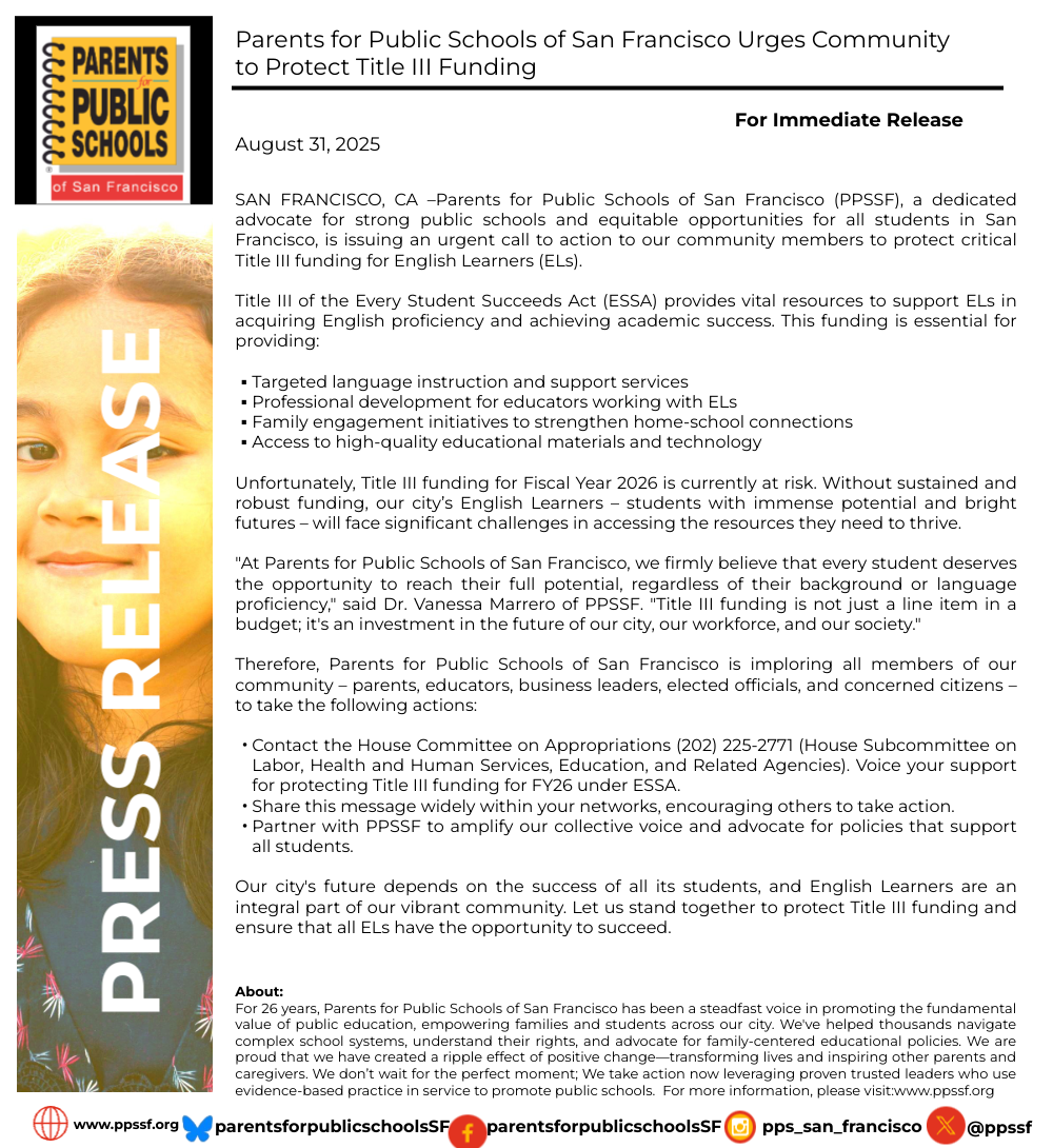 Parents for Public Schools of San Francisco (PPSSF), a dedicated advocate for strong public schools and equitable opportunities for all students in San Francisco, is issuing an urgent call to action to our community members to protect critical Title III funding for English Learners (ELs).