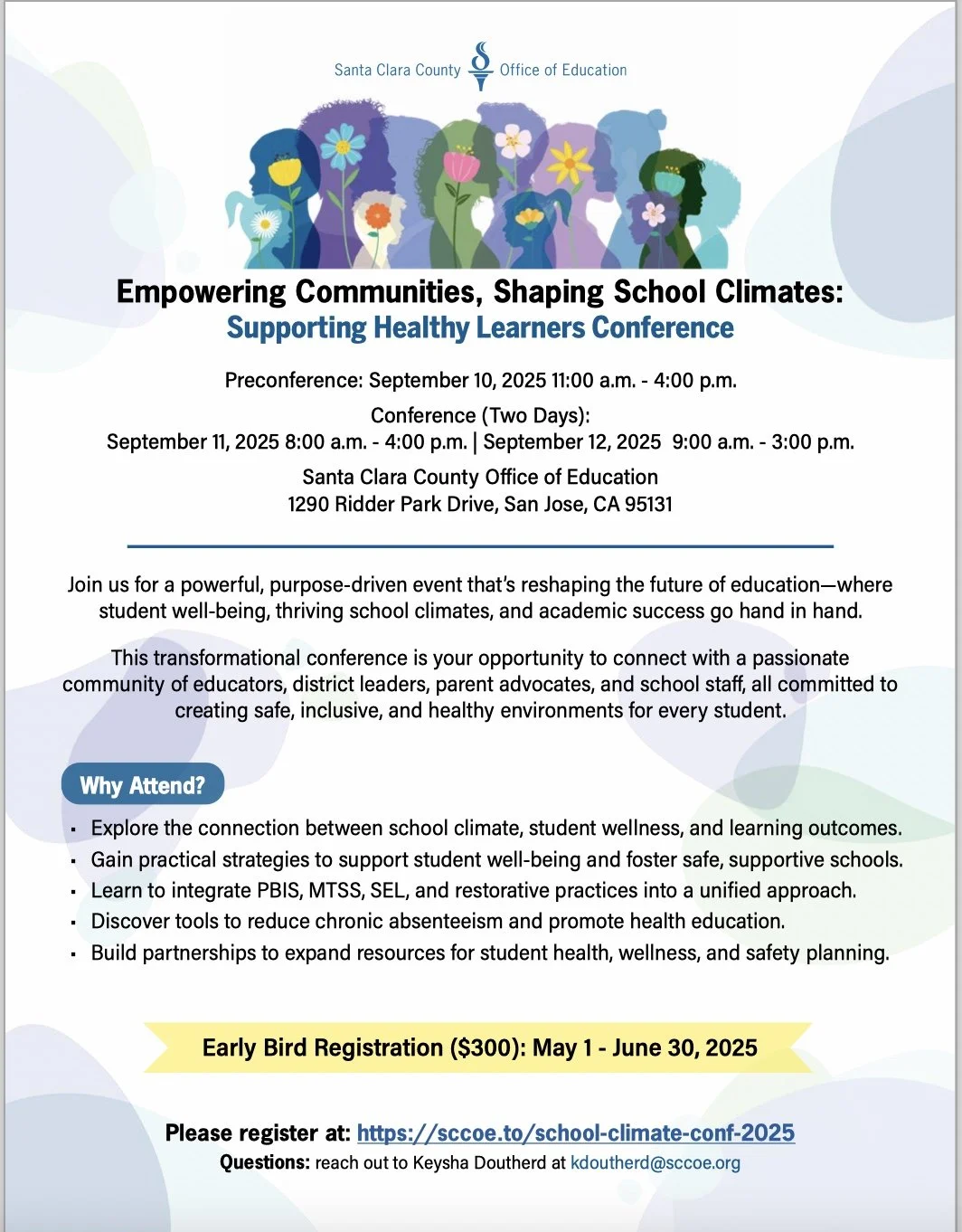 The flyer advertises the "Empowering Communities, Shaping School Climates: Supporting Healthy Learners Conference" hosted by the Santa Clara County Office of Education. It features an image of diverse people behind flowers. The flyer provides the date, time, and location of the conference and pre-conference, and a brief summary of the event's purpose, which is to connect educators, leaders, advocates, and staff to create safe and healthy environments for students. It also lists reasons to attend, such as exploring the connection between school climate, wellness, and learning, and building partnerships. The flyer also provides information on early bird registration and a link to register for the event.