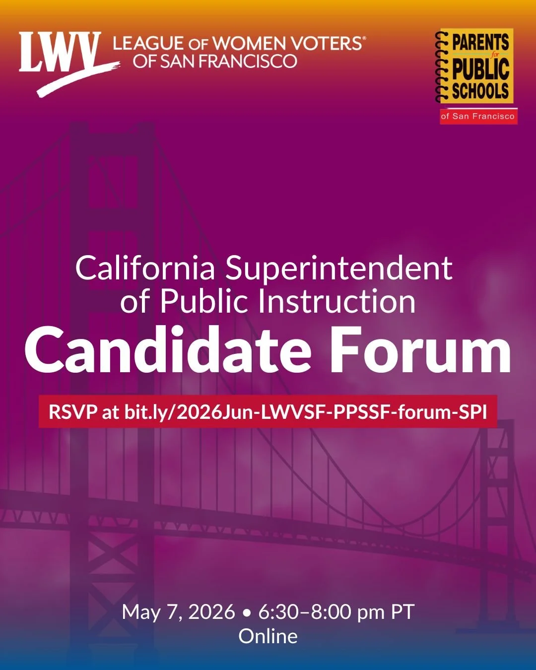 Poster with League of Women Voters of San Francisco and Parents for Public Schools logos over a purple-to-orange gradient background with a faint Golden Gate Bridge silhouette. Large text: "California Superintendent of Public Instruction Candidate Forum." Red banner: "RSVP at bit.ly/2026Jun-LWVSF-PPSSF-forum-SPI." Event details at bottom: "May 7, 2026 • 6:30–8:00 pm PT • Online."