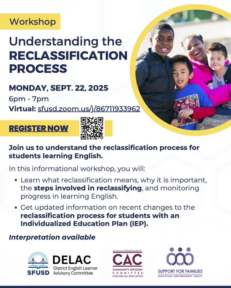 SFUSD will break down the process, explain the new changes, and empower you to advocate for your child. Register NOW: https://docs.google.com/forms/d/e/1FAIpQLScrB485gDLZtxNuDKoFI30QCkWOQiaEXlIC5oVHzO4akiEjaQ/viewform